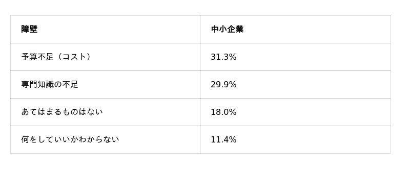 「何をしていいかわからない(11.4%)」と「専門知識の不足(29.9%)」を合わせると約4割に達し、予算不足(31.3%)を上回る最大のボトルネックとなっている可能性があります。