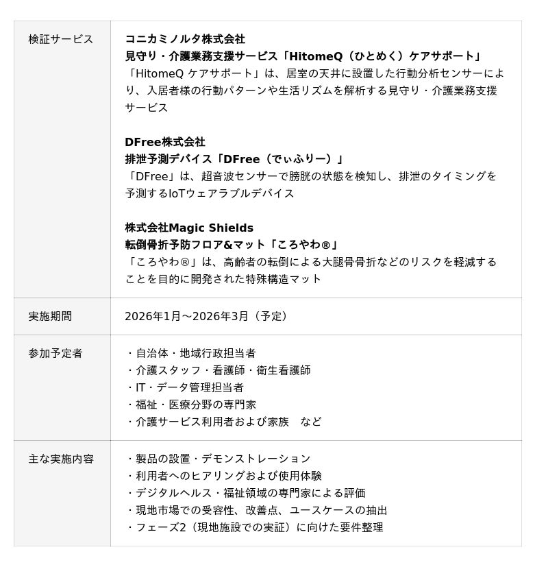 本PoCは、デンマークのラボ「Vesthimmerland」にて、介護・福祉領域向け日本製介護ソリューションを提供しているコニカミノルタ株式会社、DFree株式会社、株式会社Magic Shieldsの3サービスを、現地自治体・介護職員・専門家など多様なステークホルダーを対象に、製品体験・使用評価・インタビューを通じてニーズを把握する市場検証を行います。