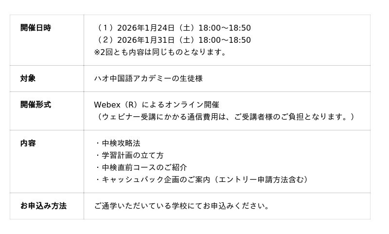 さらに、ハオでは中検合格を後押しするため、オンライン中検直前コース(2級・3級)や、中検攻略無料ウェビナー(在校生対象)の開催も予定しています。無料ウェビナーは、2026年1月24日(土)と31日(土)の2回実施し、試験攻略法や学習計画の立て方、キャッシュバック申請方法をご案内します。