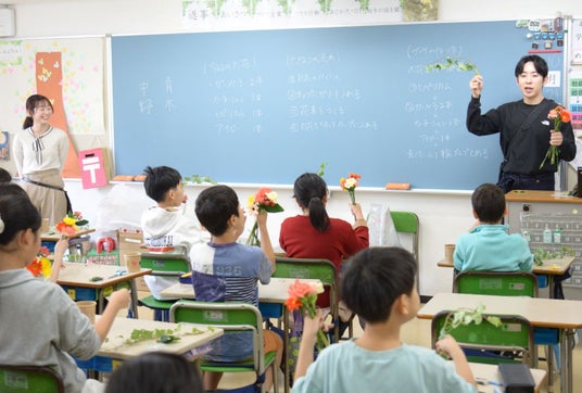 近隣小学校と連携し、給食の牛乳パックを再利用したアレンジメント教室等の花育を実施。