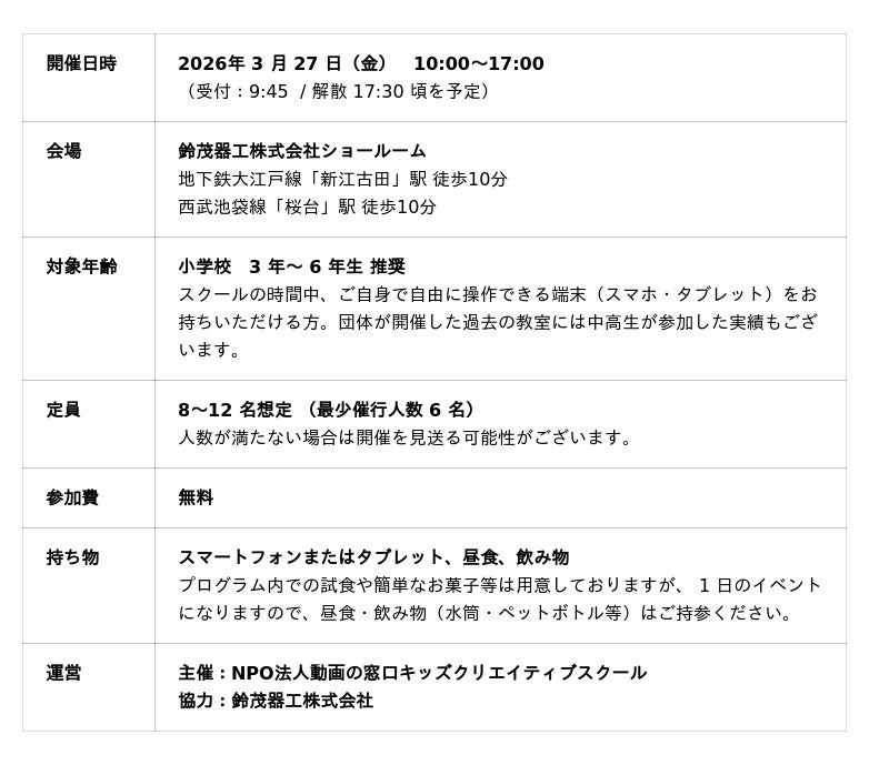 鈴茂器工株式会社(本社:東京都中野区、代表取締役社長:谷口徹)は、2026年3月27日(金)、東京事業所内ショールーム(練馬区豊玉北2-23-2)にて、子ども向けキッズスクール(キッズクリエイター)を開催いたします。