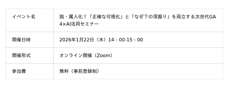 デジタルマーケティングの総合コンサルティングを行う株式会社メディックス(本社:東京都千代田区、代表取締役社長:田中正則)は、2026年1月22日(木)、マーケティング担当者を対象とした無料オンラインセミナー『脱・属人化!「正確な可視化」と「なぜ?の深掘り」を両立する次世代GA4×AI活用セミナー』を開催いたします。