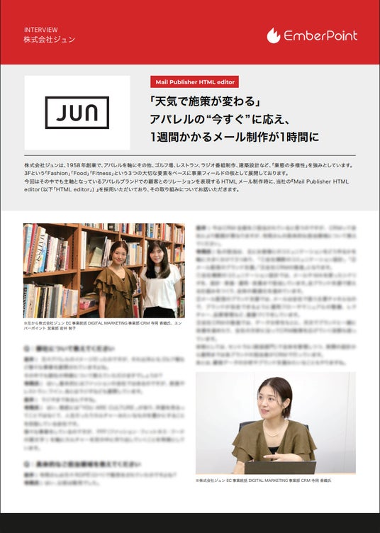 エンバーポイント、株式会社ジュンの「Mail Publisher」導入事例を公開~メール制作時間を1週間から1時間に短縮、クリック率は最大7%へ~