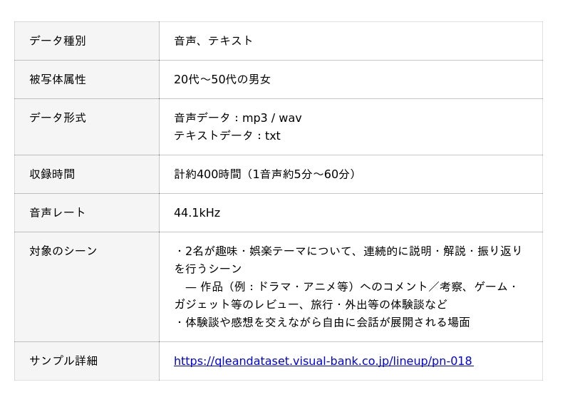 Visual Bank株式会社(東京都港区、代表取締役CEO 永井真之)は、傘下の株式会社アマナイメージズを通じて展開するAI学習用データソリューション「Qlean Dataset(キュリンデータセット)」において、ASR(自動音声認識)、NLP(自然言語処理)、LLMなどの音声・言語系AI開発に向けた「日本語・2話者・レジャーテーマトーク音声コーパスとトランスクリプト」の提供を開始しました。