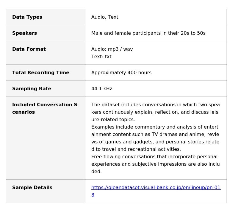 本データセットは、Qlean Datasetが展開する機械学習用データセットラインナップ『AIデータレシピ』に新たに加わるもので、レジャーや趣味、娯楽をテーマに、2名の話者が対話形式で語り合う日本語音声と、その発話内容を書き起こしたトランスクリプトを収録しています。ドラマやアニメなどの作品に対する感想、ゲームやガジェットのレビュー、旅行や外出に関する体験談など、日常的な話題を題材とした会話が含まれます。