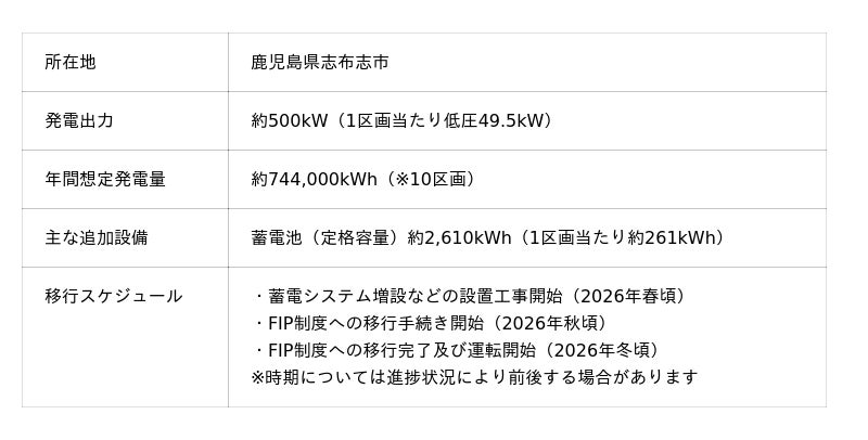 両社が保有する既設の低圧太陽光発電所のうち、当社が保有する熊本県菊池市の10区画およびブルースカイソーラーが保有する鹿児島県志布志市の10区画を対象に、FIT制度からFIP制度への移行を見据えた運用を行います。各社の役割分担は以下のとおりです。【役割】