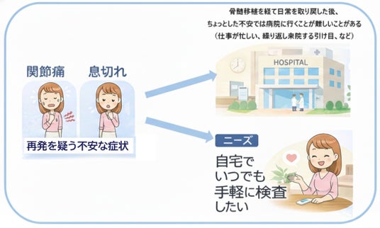 骨髄移植を経て日常生活を取り戻した患者の中には、関節痛や息切れなど、再発を疑うような不安を感じる場面が少なくありません。一方で、仕事や生活との両立、繰り返し来院する心理的・時間的負担などから、「少し気になる症状があっても、すぐに病院で検査を受けることが難しい」という課題があります。こうした背景から求められているのが、自宅で、いつでも手軽に状態を確認できるPOCT(Point of Care Testing)検査です。POCT検査は、医療機関への来院を前提とせず、日常生活の中で患者自身が状態を把握できる点に特長があり、骨髄移植後の患者の不安軽減や負担低減に寄与する新たな選択肢です。