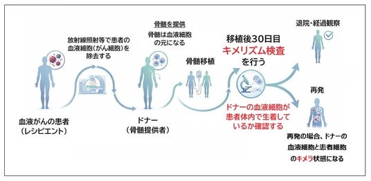 骨髄移植は血液がん治療において重要な選択肢である一方、移植後の再発兆候を高感度に把握できる保険適用検査が国内に存在しないという課題があります。その結果、多くの患者が「再発していないか」という不安を抱えながら、長期の経過観察を続けています。【骨髄移植の流れとキメリズム検査】