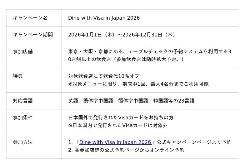 こうした訪日旅行における“食体験の重要性の高まり”を背景に、テーブルチェックとVisaは2026年も本キャンペーンを共同で実施します。