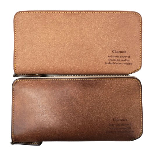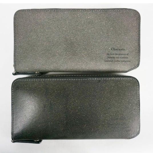 写真のエイジングサンプルは、約一年間使用して育てたシャルム・ジャーマンリサイクルシリーズの長財布(CH-188)。ブラックは艶やかに色味が深まり、ベージュカラーは温かみのある飴色へと変化している様子がうかがえます。