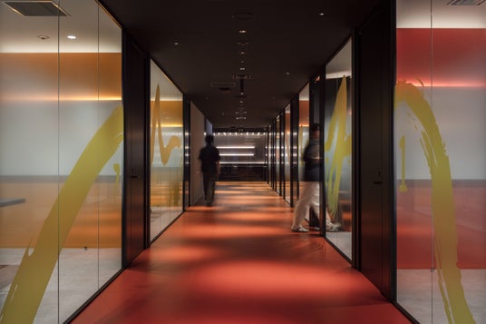 オフィスの顔となるエントランスには、オレンジ・赤・黄色といった3色からなる880個のサイコロで「仲間・成長・勝利」を表現。無数のサイコロが広がる様子は、SNSの拡散力や多方面への広がりを想起させるデザインとなっています。 また、コーポレートカラーであるオレンジ「ブレイズ」は、太陽やキャンプファイヤーのように、古来より人が集ってきた場所(火)をイメージソースとしており、「人が集い、熱量を分かち合う場所にしたい」という強い思いを込めました。