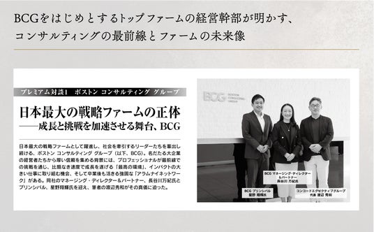 - プレミアム対談1「日本最大の戦略ファームの正体──成長と挑戦を加速させる舞台、BCG」