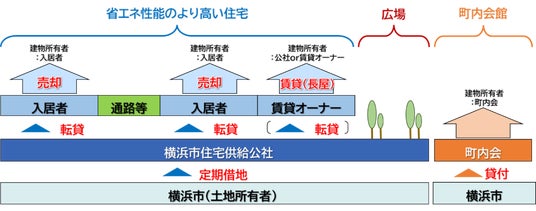 建設する住宅は、公社が入居者に対し一般定期転借地権付住宅等として販売します。なお、事業対象地内に整備予定の町内会館については、別途町内会が建設を行う予定です。