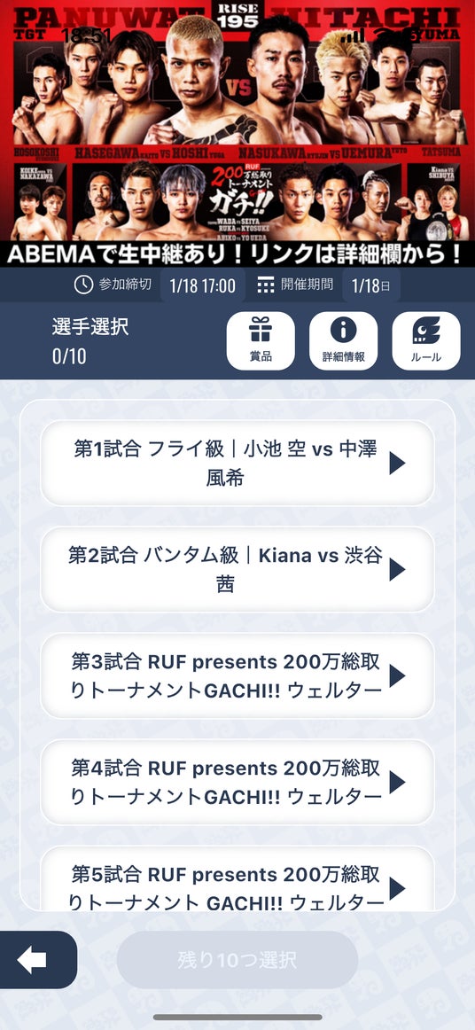これらの注目カード、「メインイベント 第7代RISEスーパーフェザー級 王座決定戦 パヌワット・TGT vs 常陸飛雄馬」、「セミファイナル RUF presents 200万総取りトーナメント GACHI!! ウェルター級」を含む全試合を、試合前に予想して楽しむことができます。