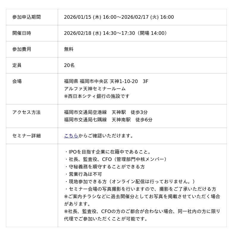 九州から上場を、新時代のIPO戦略と福証活用の全て。「市場選択」と、勝てる内部管理体制の設計図セミナーを2/18福岡で開催
