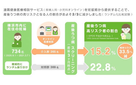 これまでで最も大規模な研究は、横浜市と連携し、国立大学法人東京大学の研究チームが主体となって実施された「産後うつ病の症状予防におけるオンライン相談サービスの有効性(ランダム化比較試験)」です。この700名超を対象とした研究により、当社が提供する「産婦人科・小児科オンライン」を提供したグループは提供していないグループに比べて、産後うつ病の高リスクとなる人の割合が33.5%減少したことが証明されました。