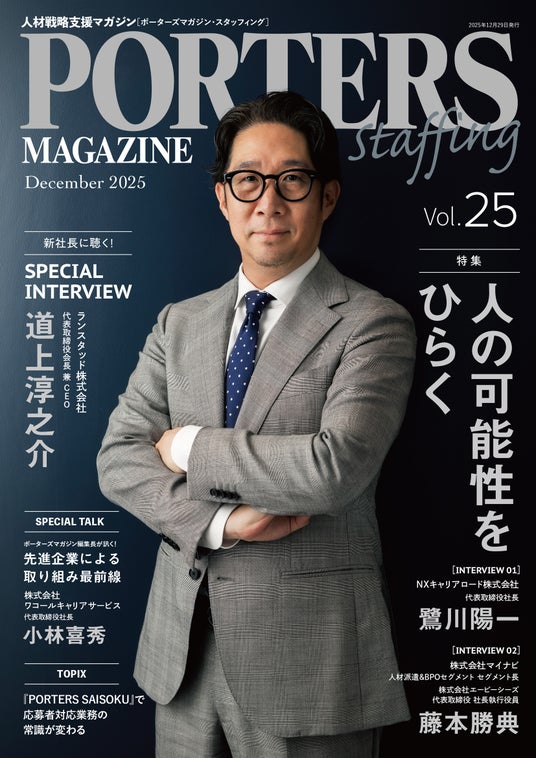 人材ビジネス向けクラウドシステムを提供するポーターズ株式会社(本社:東京都港区、代表取締役:西森康二)は人材戦略支援マガジン『PORTERS MAGAZINE Staffing Vol.25』を2025年12月26日に発行し、本日2026年1月16日よりWebサイトの公開をいたしました。