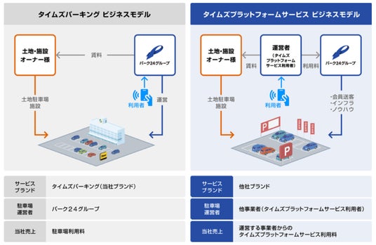 「タイムズプラットフォームサービス」は、タイムズ24をはじめとするパーク24グループが保有する駐車場およびカーシェアリングに関するノウハウやインフラ、効率的な運営・管理を可能にする独自機能等を他社に提供し、他社ブランドでの駐車場事業やカーシェアリング事業の展開を支援するサービスです。ドライバー向け会員制サービス「タイムズクラブ」のポイントがためたり使えたりするほか、法人向けサービス「タイムズビジネスサービス」のタイムズビジネスカードでの精算が可能なため、集客力の向上にも貢献します。