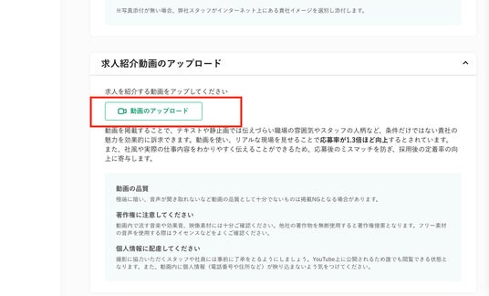 求人掲載企業は、求人ページと企業ページそれぞれ1本の動画をアップロード(掲載申請)することができ、運営側のチェックののちに求人ページや企業ページに掲載されます。同時にYouTube上でも公開されます。