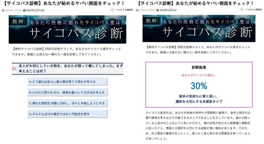 テレシスネットワーク株式会社(本社:東京都港区、代表取締役:鷹石惠充 https://www.telsys.co.jp/)は、2026年1月9日より、運営する占いコンテンツポータル『うらなえる』にて【サイコパス診断】の提供を開始いたしました。
