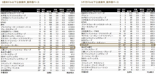 「中規模市場 日本M&Aレビュー2025年(1‐12期)」において、昨年度ランキングから大きく飛躍、5億米ドル以下・5千万ドル以下ともに順位が5ランクアップ。