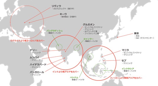 日本は本社とR&Dの機能を果たし、クリニック事業(義足直販)は、フィリピンの2箇所のクリニックと、インドの5箇所のクリニックで、現地製造による患者様への義足の直販が行われています。