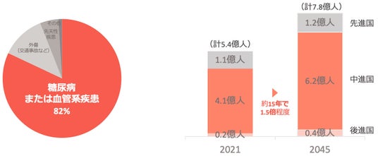 (左から) 義足利用者における糖尿病の割合(※7)、糖尿病患者の増加予測(※8)