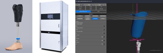 (左から) 3Dプリント義足、義足用 3Dプリンタ、義足設計用 3DCAD