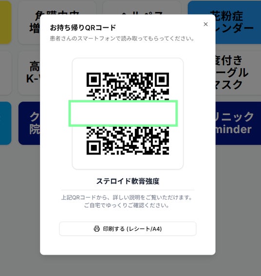 ボタンの右上にカーソルを持ってくるとQRエリアが出てきます。患者さんに画面上でQRを提示してスマホで撮っていただいたり、印刷機能もあります。