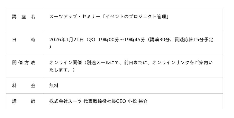 当社では、2026年1月21日(水)19時から、当社代表の小松が講師を務めるスーツアップ・セミナー「イベントのプロジェクト管理」を無料開催します。