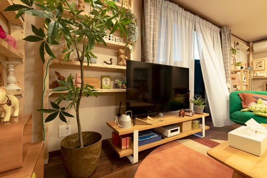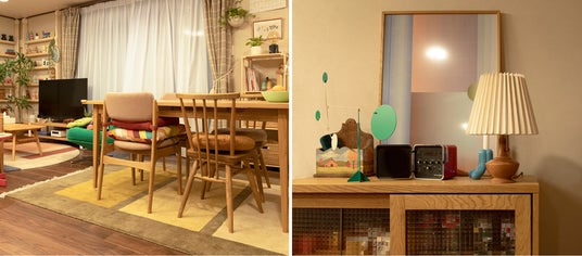 一家が集うリビングには「THE TV BOARD / LOW TABLE 無垢 ホワイトオーク」をはじめ、グリーンやランプが導入され、家族の日常に穏やかな心地よさを添えています。