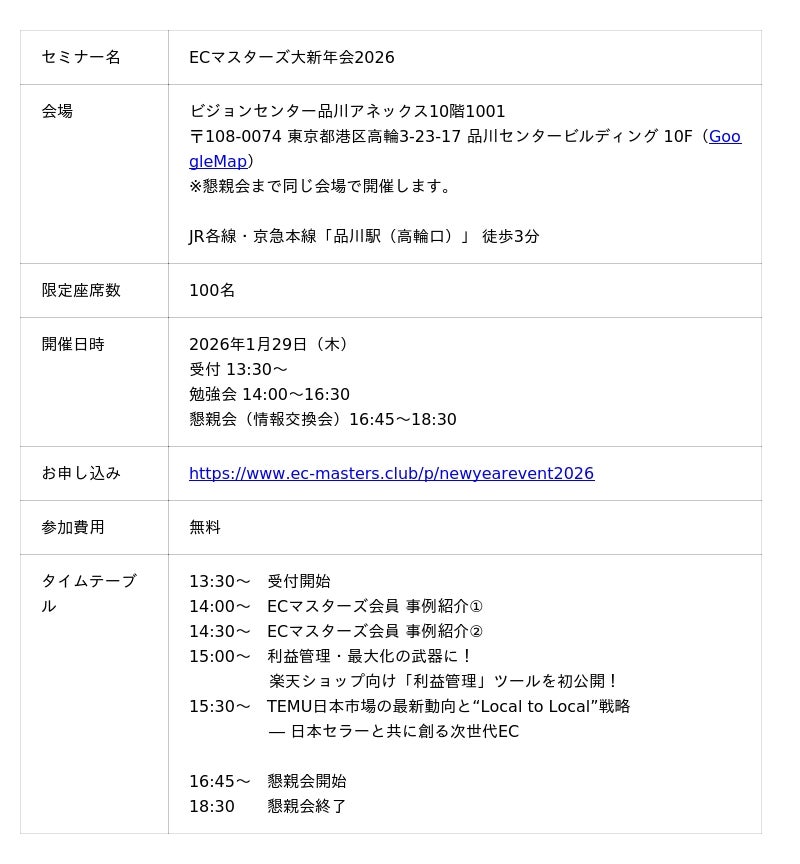 【1/29(木)オフライン】楽天新春カンファレンス前日に交流!あのTEMUがECマスターズ会員向けに初登壇!ECマスターズ大新年会2026開催決定