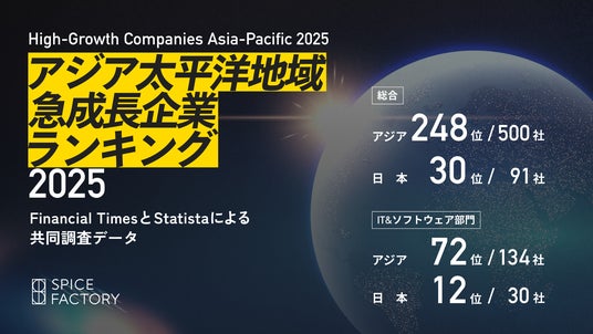 デジタル・トランスフォーメーションを支援するスパイスファクトリー株式会社(本社:東京都港区、代表取締役CEO:高木 広之介)は、英・Financial Times社と独・Statista社が共同で実施した、Financial Times Ranking: High-Growth Companies Asia-Pacific 2025(アジア太平洋地域における急成長企業ランキング2025)の上位500社に選出されました。【総合】アジア 248位/日本 30位、【IT&ソフトウェア部門】アジア 72位/日本 12位に評価されています。