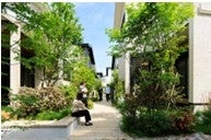 三方を道路に囲まれた全15棟の分譲住宅です。地役権を設定 した共用の敷地に、通行路である小路(フットパス)ではなく、「滞 在する行為」を促す小路「ステイパス」(Stay:滞在する、Path:小 路)を計画しました。建物内と外を緩やかにつなぐことで、住民同 士の持続可能なコミュニティ形成、緑の街並み景観、歩車分離に よる安全安心を実現し、心地よい住環境を創出しています。