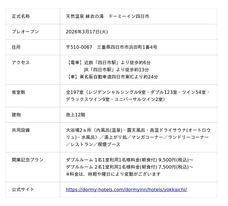 『ドーミーイン四日市』公式WEBサイト: https://dormy-hotels.com/dormyinn/hotels/yokkaichi/