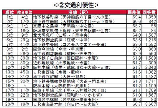 街の住みここち沿線ランキング2024<関西版> 因子別評価 TOP20 2.
