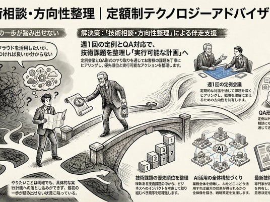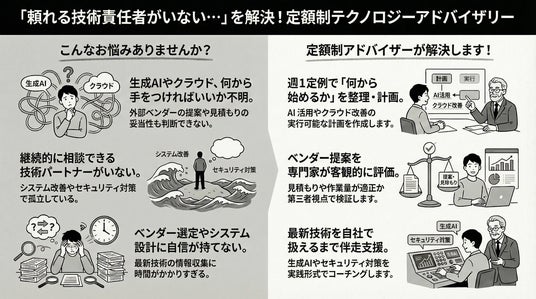 生成AIやクラウド活用を推進したい意欲はあるものの、何から着手すべきか分からず、外部ベンダーの提案内容や見積もりの妥当性を判断できる専門知識が社内にないDX推進室。AWS・GCPなどシステム基盤の改善やセキュリティ対策を進めたいが、自社に詳しい人がいない領域が多く、継続的に相談できる技術パートナーが不在で孤立している情報システム部。AI駆動開発や最新技術を取り入れたいが、情報収集に時間がかかり、システム設計やベンダー選定の意思決定に自信が持てないプロジェクトマネージャー--このような悩みを抱える企業は少なくありません。