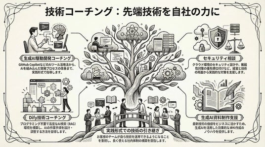 生成AI駆動開発やDifyを活用したノーコード開発、サイバーセキュリティ対策など、実際の技術導入を実践形式でコーチングします。最新技術の価値をビジネスに活かすアプローチでAWS・GCPのシステム設計相談にも対応。お客様チームが自分たちで運用できるよう技術の引き継ぎを重視し、長く使える体制づくりを目指します。
