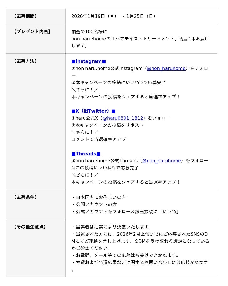 株式会社nijito(本社:東京都港区、EC部門:福岡市中央区)が展開する『ダブル泡設計』×『素髪保湿設計』のヘアケアブランド non haru:home(ノンハルホーム) は、新感覚!泡トリートメントで話題の「ヘアモイストトリートメント」をInstagram・X・Threadsの公式アカウントをフォロー&いいね!等で抽選で100名様に当たるキャンペーンを開催いたします。
