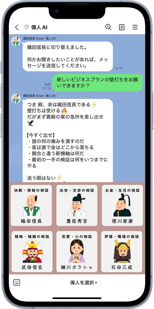 偉人AIは、LINE上で6名の偉人から1人を選択し、その人物の思想・価値観・語り口を再現したAIと対話できるサービスです。