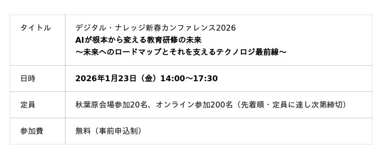 1995年創業、30周年を迎えた日本初のeラーニング専門ソリューション企業、株式会社デジタル・ナレッジ(本社:東京都台東区、代表取締役社長:はが弘明)は、1月23日(金)に開催する「デジタル・ナレッジ 新春カンファレンス2026」において、これらをテーマとした特別講演を実施します。教育AI時代の転換点を捉え、設計・制御という視点から次の一手を考える内容です。