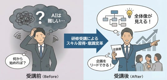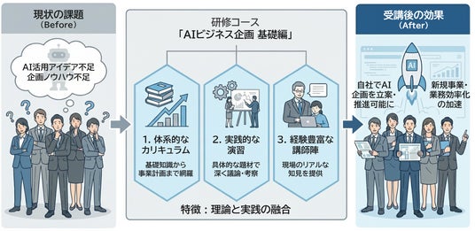 「AIビジネス企画 基礎編」が解決する課題・受講後効果のイメージ