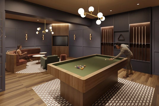 約100平方メートル のラウンジにはキッチンやダイニングテーブルやソファスペースのほかビリヤード台も備え、食事、仕事、コミュニケーション、リラックスなど、用途に応じて使い分けができる空間構成となっています。