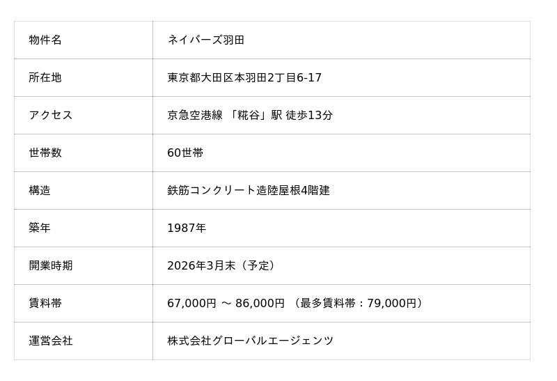 株式会社グローバルエージェンツ(本社:東京都渋谷区、代表取締役:山崎剛)は、当社が運営する交流型賃貸マンション「ソーシャルアパートメント」の新規物件として、2026年3月末に京急空港線「糀谷」駅より徒歩13分の立地に、「ネイバーズ羽田」を開業いたします。