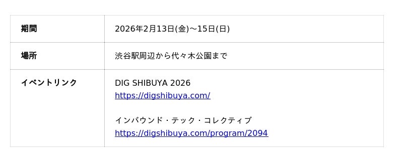 シブヤスタートアップス株式会社(本社:東京都渋谷区、代表取締役社長:田坂 克郎、以下、シブヤスタートアップス)と株式会社Pie Systems Japan(本社:東京都中央区、CEO:水野 博商、以下Pie Systems)は、テクノロジーと文化の実験場としてのフェスティバル「DIG SHIBUYA 2026」(2026年2月13日~15日)において、インバウンドに関連するテクノロジーを活用した地域産業およびイベントの振興に向けた実証「インバウンド・テック・コレクティブ」を開始します。