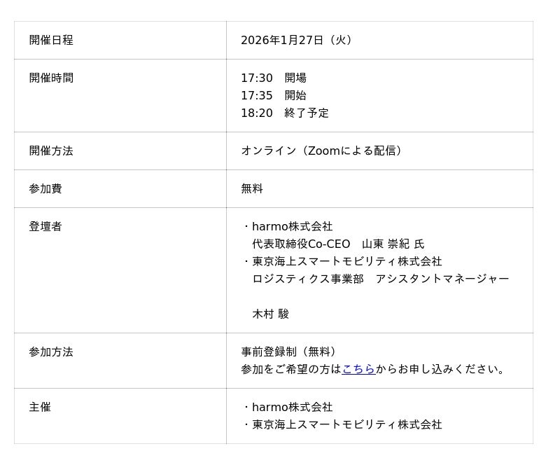 東京海上スマートモビリティ株式会社(本社:東京都千代田区、代表取締役社長:原田秀美、以下「東京海上スマートモビリティ」)は、2026年1月27日(火)にharmo株式会社(本社:東京都港区、代表取締役Co-CEO 山東 崇紀、代表取締役Co-CEO 内上 昌裕、以下「harmo」)と「社員への健康施策が産む、運輸業の組織変革 ~健康管理DXから始める 事故防止と、事業成長の道~」ウェビナーを開催します。
