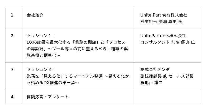 マニュアルトータルソリューションを提供し、企業の業務効率化を支援する株式会社テンダ(本社/東京都渋谷区、代表取締役会長兼社長CEO/薗部 晃、以下「テンダ」)は、Unite Partners株式会社と共に、オンラインセミナー「業務改善を起点としたDX推進 ― 業務の見直しによる第一歩 ―」を、2026年2月4日(水)に開催いたします。