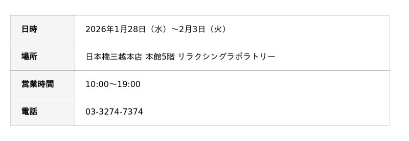 『永遠の美しさへの夢が、夢に終わらない未来を創りあげること』を使命に掲げる、化粧品の研究開発・製造販売を行う株式会社エテルナム(本社:東京都渋谷区、代表取締役:松本隆明)は、2026年1月28日(水)~2月3日(火)の期間中、日本橋三越本店 本館5階 リラクシングラボラトリーにてPOP UPを開催いたします。
