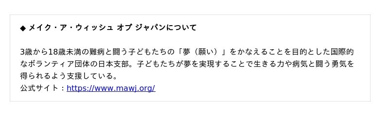 寄付を受け取ったメイク・ア・ウィッシュ オブ ジャパンの鈴木事務局長は「子どもたちにとって、とても心強いご支援です。"自分たちは、世の中から忘れられていないんだ"と思えることは、彼らの生きる希望となります」とコメントしています。
