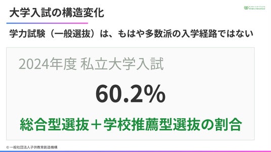 現在、大学入試の定員の過半数が、学力試験のみの一般選抜から「総合型選抜・学校推薦型選抜(年内入試)」へと移行しています。これに伴い、生徒自身の主体性やビジョン、論理的表現力が問われるようになりました。